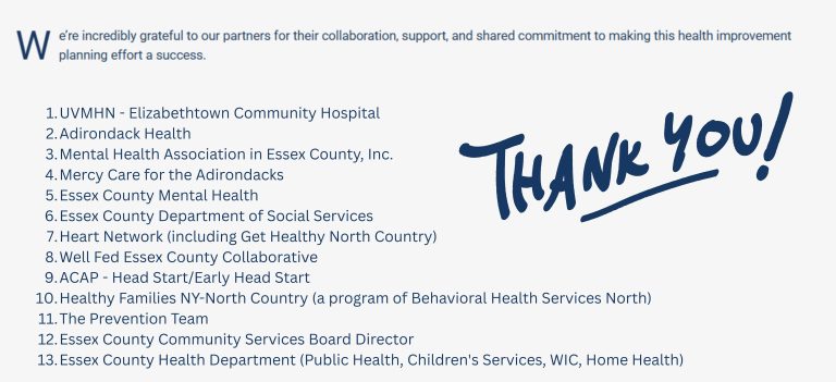 Periodically, the health department and community partners survey Essex County residents to identify health challenges. These results form a Community Health Assessment that directs their joint efforts to improve local health.