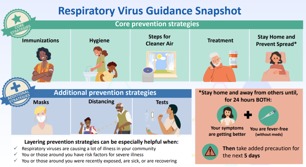 The guidance below from the CDC gives practical recommendations and information to help people lower risk from a range of common respiratory viral illnesses, including COVID-19, flu, and RSV.